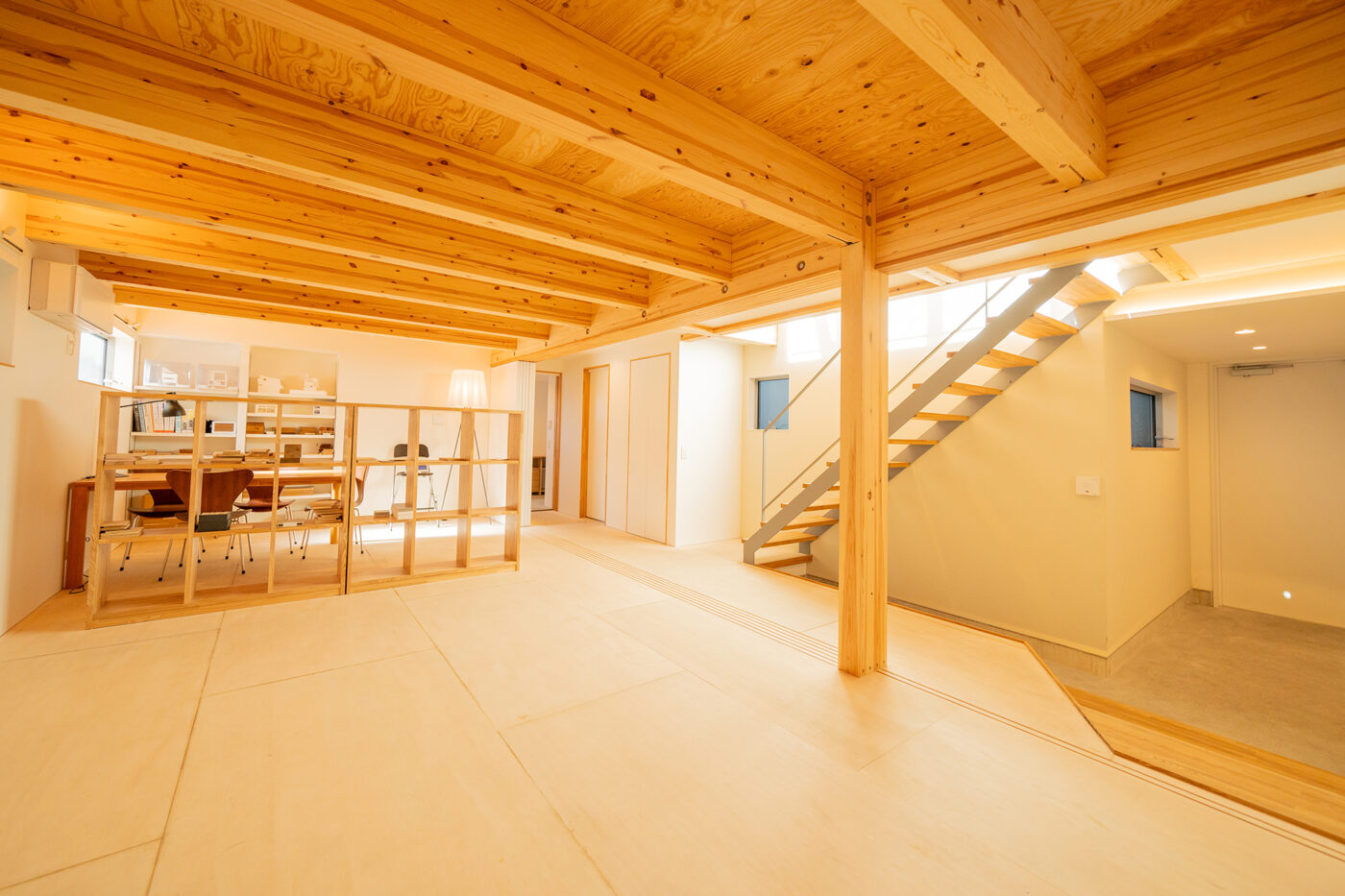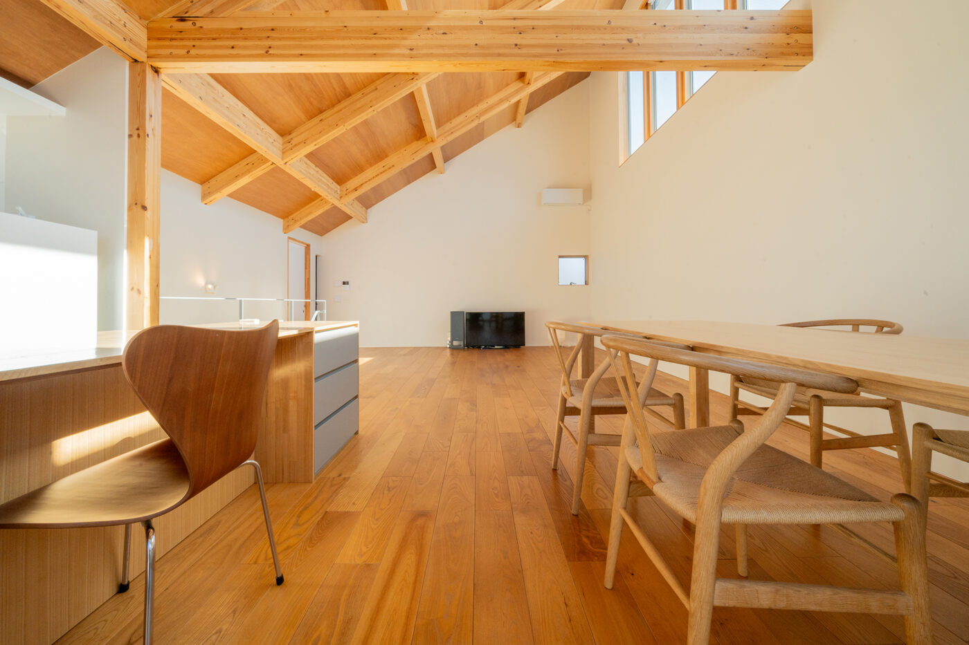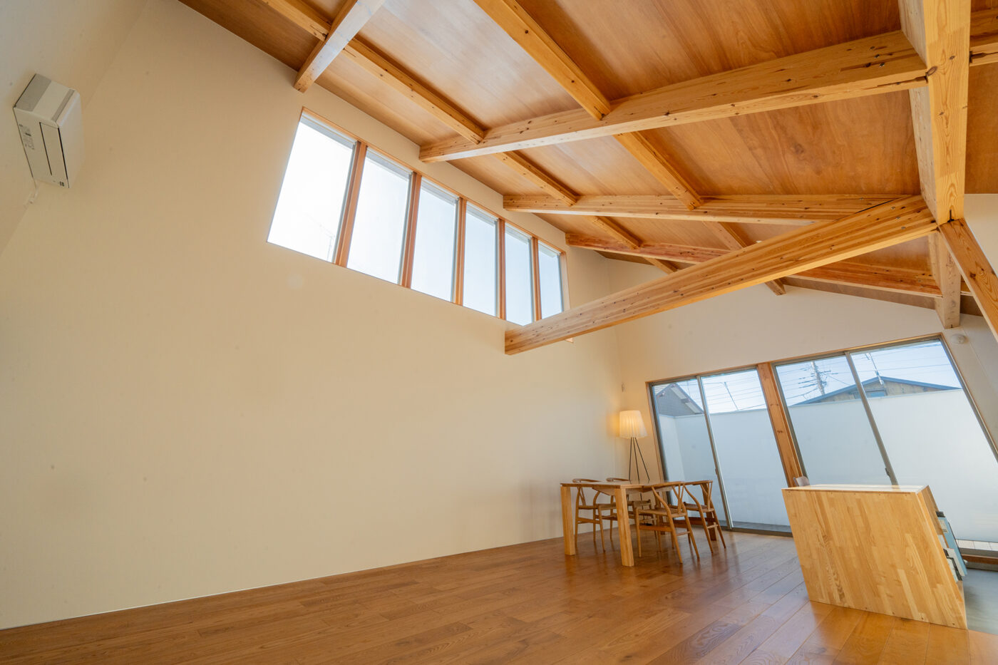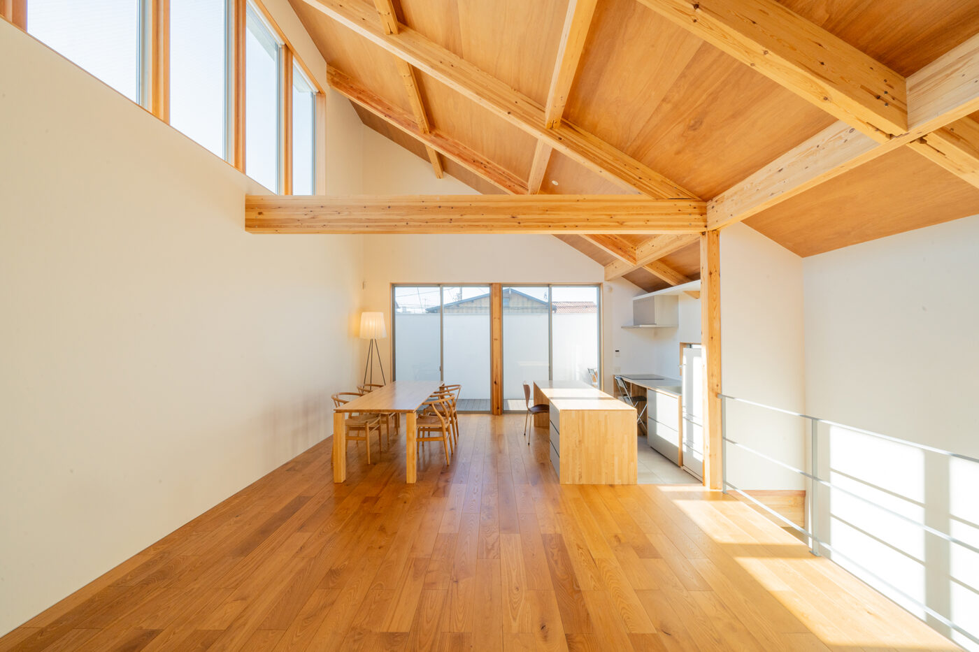 天井いっぱいに広がる無垢材の梁と板張り天井は、ただ“広い”だけでなく、木の温もりと安心感を空間全体に与えています。