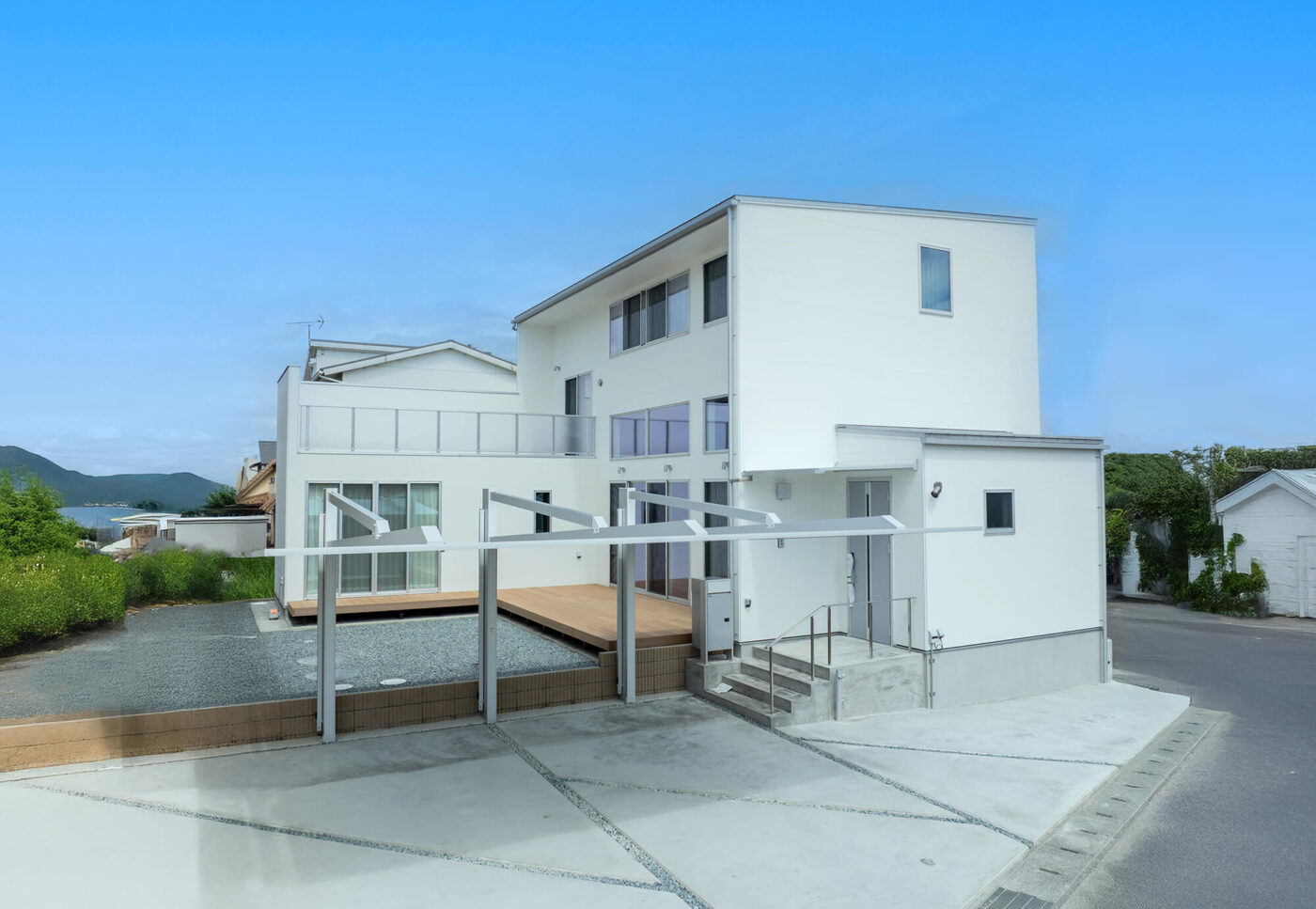 ゆとりある駐車スペースやウッドデッキと隣接する庭空間など、外と内のつながりを丁寧に設計しています。