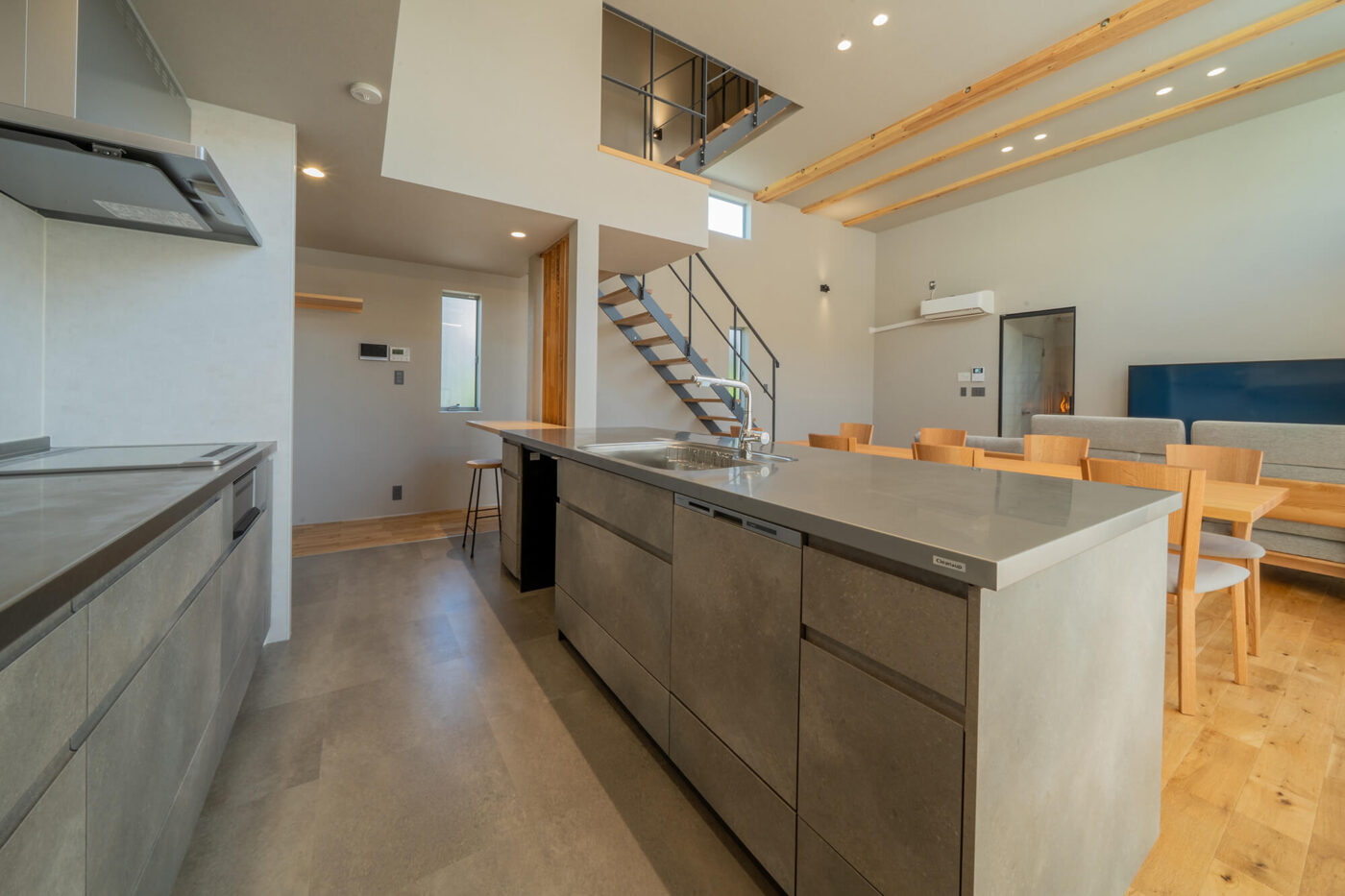 キッチンは手元がすっきりと見えるデザインで、生活感を抑えつつ使い勝手は良好。