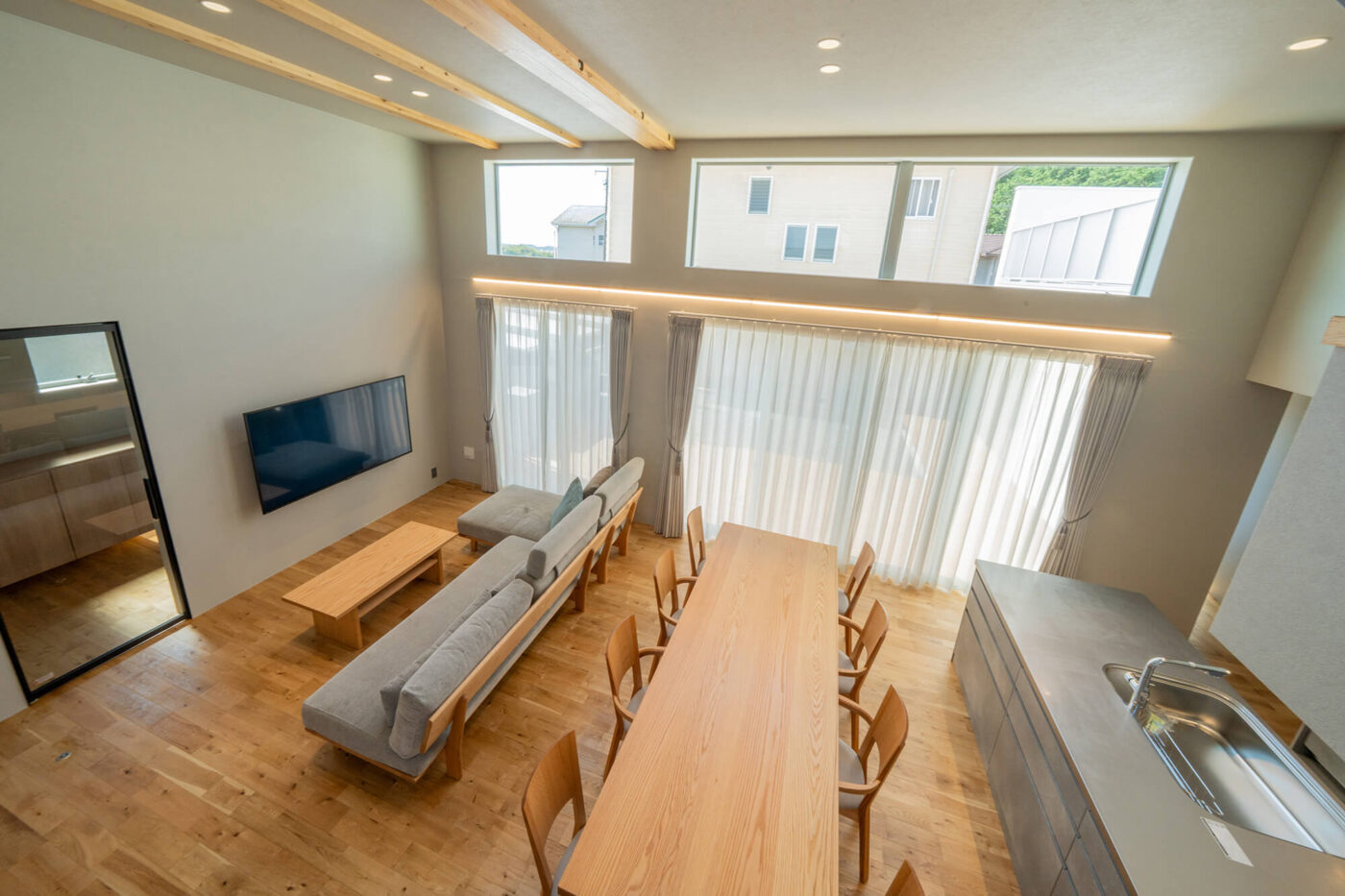 本邸ではその特性を生かし、リビングに大きな吹き抜けを設け、上部には横長のハイサイドライトを配置。季節や時間によって変わる自然光が、室内へやわらかく広がり、日常の中に豊かな表情をもたらします。