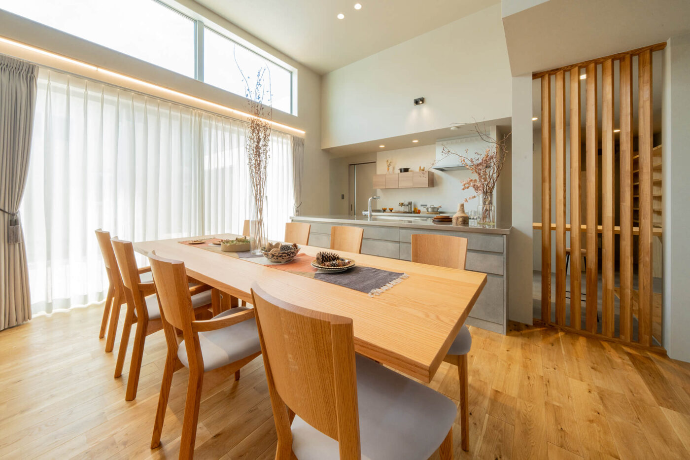 光が豊かに届くこの場所は、食事だけでなく、家族の会話、子どもの勉強、ちょっとした作業など、日々の時間をやさしく支える場所になります。