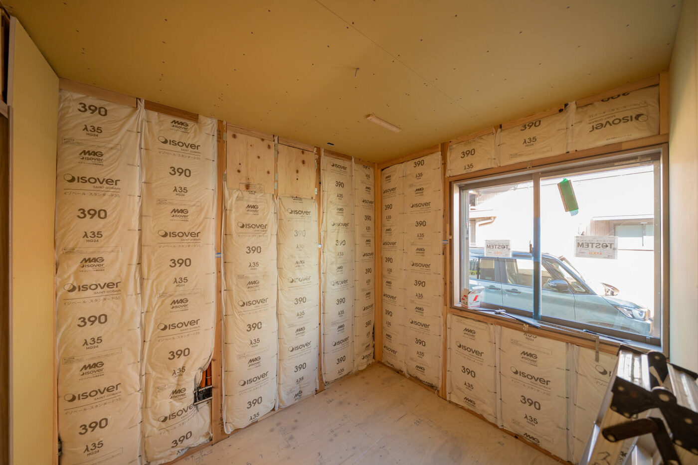 室内では、断熱材の施工が済み、天井のボード張りが進んでいました。