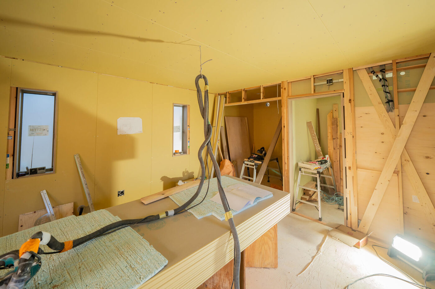 それが今回は、天井や壁のボード施工が進み、空間の輪郭がぐっとはっきりしてきています。